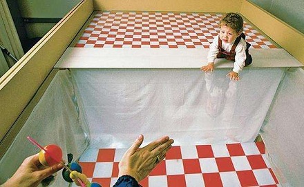 研究者制作了平坦的棋盘式的图案,用不同的图案构造以造成「视觉悬崖」的错觉,并在图案的上方覆盖玻璃板。将2~3个月大的婴儿腹部向下放在「视觉悬崖」的一边,发现婴儿的心跳速度会减慢,这说明他们体验到了物体深度:当把6个月大的婴儿放在玻璃板上,让其母亲在另一边招呼婴儿时,发现婴儿会毫不犹豫地爬过没有深度错觉的一边,但却不愿意爬过看起来具有悬崖特点的一边,纵使母亲在对面怎么叫也一样。这似乎说明婴儿已经具备了深度知觉,但这种深度知觉是与生俱来的,还是在出生后几个月里学来的,目前还没有定论。