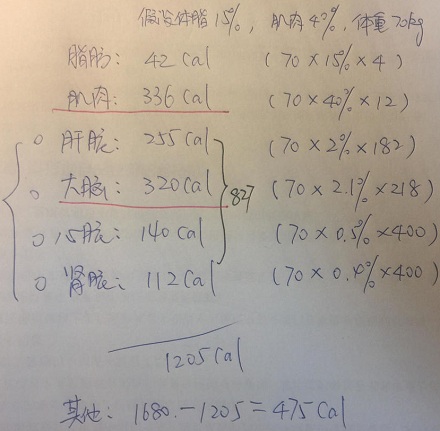 静止状态时,身体的主要器官——大脑、肝、肾和心脏,消耗占总能量的一半;另一半则是由脂肪组织、消化系统,特别是肌肉所消耗。(上图数据大体比例基本相符)。