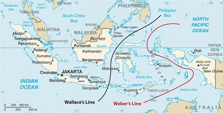 「华莱士线」是动物分布的一个非常真实的边界,从印度洋开始,穿过巴厘岛和龙目岛,绕过婆罗洲最后到达菲律宾东部。