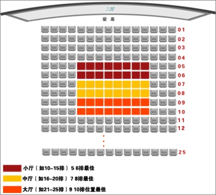 简单来说,小厅选择第 5 第 6 排,中厅选择第 7 第 8 排,大厅选择第 9 第 10 排。另外观看 3D 电影时,荧幕亮度会相对减弱 40%,都要往前再挪 1 到 2 排,效果才会达到最佳。