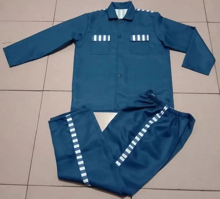 标准的春秋款囚服是蓝灰的外套长裤,胸前、后背、两侧裤缝有白色的条纹,象征的监狱的铁窗铁门。