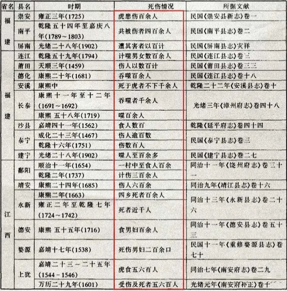 多到一出门可能就被老虎吃了的程度,每年都有百余人甚至上千人被老虎袭击。下表是明清时期虎患的统计数据: