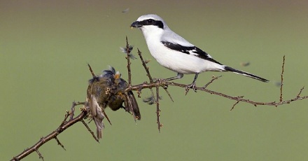伯劳鸟不仅具有尖锐的喙,起到撕扯猎物的作用。它们还有一个强悍的外挂,那就是犹如利钩一般的脚趾。伯劳鸟惯于将捕获的饵物穿挂在荆刺上,随即开始它们尤为残忍的活剥工作。