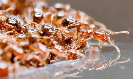 火蚂蚁群形成漂浮物后,它们的性质更像液体,而不是蚂蚁本身。由于红火蚁身上的细毛具有很强的疏水性,这种方式可以使得它们在水中生存好几周。