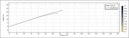 有人模拟出高尔夫球 (实线) 和光滑小球 (虚线)被击打后的轨迹发现:与光滑球相比,有凹痕的球飞得更高更远。