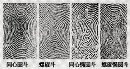 指纹有两大类,一类是漩涡形的螺 / 斗纹,一类是流状的箕纹。