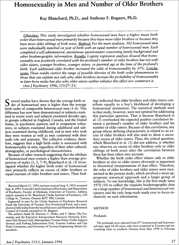 这种由同母哥哥数量所导致的同性恋,约占男同性恋总数的七分之一。