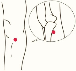 屈膝,用拇指沿小腿内侧骨内缘由下往上推至膝关节下时,触及一凹陷处即是。