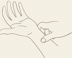 于前臂内侧上方(偏拇指侧) 向腕关节方向推;推至腕掌侧横纹,推至遇骨节阻挡,触及桡动脉搏动处,即太渊穴。