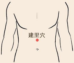 仰卧,沿建里穴旋转按摩,每日早晚各按摩 1 次,每次 50 圈;还可以从建里穴自上向下推摩至神阙穴 (即肚胶) 5 分钟,会感觉上腹有舒适温热感。