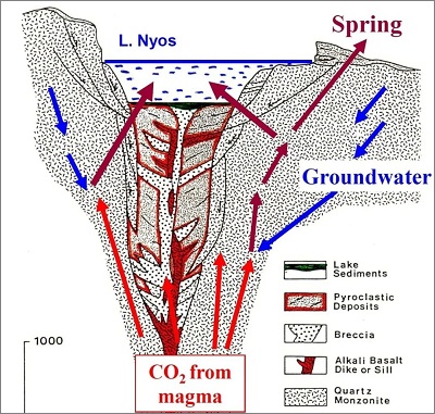 原来,尼奥斯湖下方的地层里长期有二氧化碳溢出(来源和深层的岩浆活动有关),排放进深层湖水。
