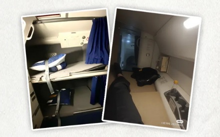 飞国际长途的飞机上都有乘务员休息区,有的在行李架上方,有的在座舱下方。